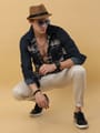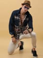 The model ( Waist-79cm, Hips-96cm, Height-183cm) is wearing a size 32 Fit: Tailored Fit Length: Regular Length Waist Type: Mid Rise Pattern: Solid Fabric: 98% Cotton 2%Lycra Wash Care: Gentle Wash Special Features: Zip Fly Precisely Stiched Waist Band Extended Waist Band"