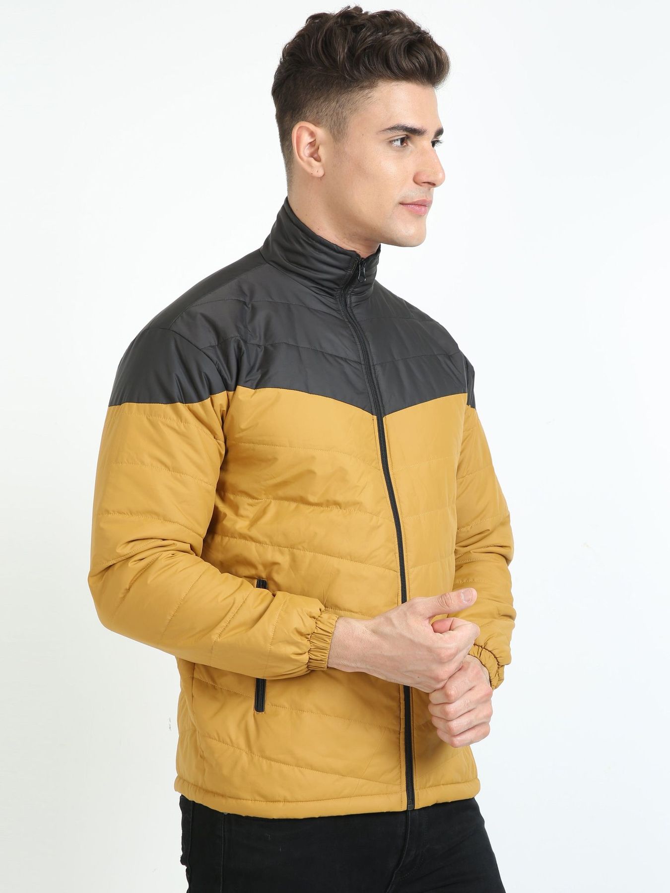 66766168f2b4697a077578c4Golden-Black Cut & Sew JacketGolden-Black Cut & Sew JacketThis windcheater features a single polyfill layer for lightweight insulation, providing warmth without bulk, making it an ideal choice for chilly days. Product Specification: Bomber Jacket Cut & Sew Single Polyfill Fabric: Cire Coated Size: Model is wearing M size Wash Care: Dry Clean, No Machine Wash