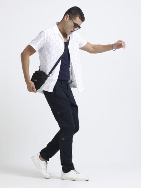 67af36c2a40cf3002be784c5Men Lazy Linen Utility Cargo-NavyMen Lazy Linen Utility Cargo-NavyThe Men s Lazy Linen Utility Cargo Trousers are crafted from a comfortable blend of 98% cotton and 2% Lycra, offering a soft and breathable feel with just the right amount of stretch for all-day wear. Designed with a relaxed fit and mid-rise waist, these trousers provide a laid-back yet stylish look. The elastic waist with a button ensures a secure, adjustable fit, while the multiple utility cargo pockets offer ample space for storing your essentials. Perfect for both casual outings and outdoor activities, these cargoes are easy to care for with hand wash instructions and a reverse ironing recommendation to maintain their quality. A versatile, functional, and fashionable addition to your wardrobe.